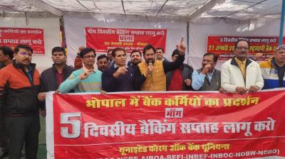 भोपाल में बैंक कर्मियों का जोरदार धरना प्रदर्शन पाँच दिवसीय बैंकिंग सप्ताह लागू करने की मांग बुलंद