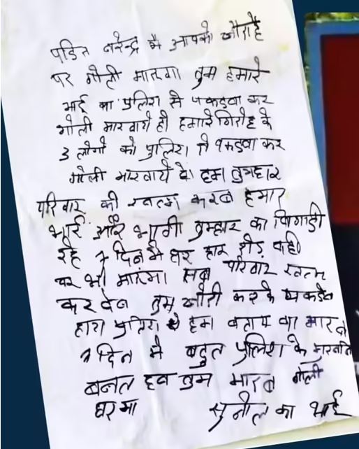पत्र में लिखा गया कि ‘मैं आपको चौराहे पर गोली मरूंगा, तुमने हमारे भाई और हमारे गिरोह के 3 सदस्यों को पुलिस से गोली मरवाई है। 7 दिनों के भीतर हम तुम्हारा परिवार खत्म कर देंगे। बहुत पुलिस के मुखबिर बनत हव। हम तुमहार परिवार खत्म करब। हम तुमका घर में गोली मारब।