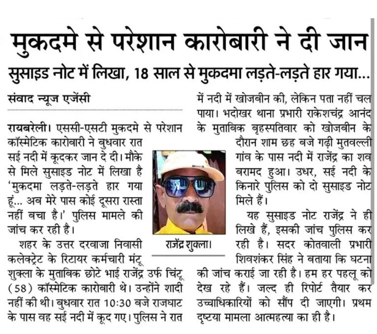 रायबरेली: कोर्ट-कचहरी का चक्कर कितना खतरनाक हो सकता है, ये यूपी के रायबरेली में देखने को मिला। 18 साल से चल रहे मुकदमे से परेशान होकर कॉस्मेटिक कारोबारी ने बुधवार रात सई नदी में कूदकर अपनी जान दे दी। घरवालों को पता चला तो वे भागकर वहां पहुंचे। पुलिस और बचाव दल ने काफी प्रयास किया। गुरुवार सुबह उनका शव बरामद हुआ। नदी किनारे दो सुसाइड नोट मिले हैं। पहले सुसाइड नोट में 58 साल के कारोबारी राजेंद्र उर्फ चिंटू शुक्ला ने लिखा है कि वह मुकदमा लड़ते लड़ते हार गए हैं। अब उनके पास दूसरा कोई रास्ता नहीं बचा है। घर के सभी बड़े बुजुर्गों को मेरा सादर प्रणाम। हो सके तो मुझे माफ कर देना।