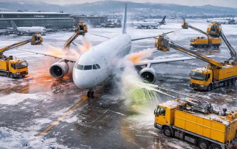 ज्यूरिख एयरपोर्ट के विशेष ‘डी-आइसिंग पैड्स’ पर यह प्रक्रिया बेहद सावधानी से पूरी की जाती है। यहाँ बड़ी-बड़ी क्रेननुमा गाड़ियाँ (डी-आइसिंग ट्रक्स) विमान को चारों ओर से घेर लेती हैं। यह प्रक्रिया दो मुख्य चरणों में पूरी होती है। सबसे पहले, विमान पर गर्म पानी और ‘प्रोपलीन ग्लाइकोल’ के मिश्रण का छिड़काव किया जाता है। इसे ‘टाइप 1’ फ्लूइड कहते हैं, जो आमतौर पर नारंगी रंग का होता है ताकि ऑपरेटर देख सके कि विमान का कौन सा हिस्सा साफ हो चुका है। यह गर्म मिश्रण जमी हुई बर्फ को तुरंत पिघला देता है। इसके बाद, यदि बर्फबारी जारी है, तो ‘एंटी-आइसिंग’ प्रक्रिया अपनाई जाती है। इसमें ‘टाइप 4’ फ्लूइड का उपयोग होता है, जो हरे रंग का और जेली जैसा गाढ़ा होता है। यह पंखों पर एक सुरक्षा परत बना देता है, जिससे टेक-ऑफ के दौरान नई बर्फ नहीं जम पाती।