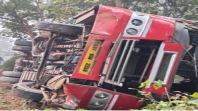 सड़क हादसा : तीर्थयात्रियों से भरी बस अनियंत्रित होकर पलटी, आठ को सामान्य चोट